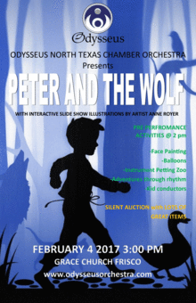 In February, the orchestra will present a family affair with a repeat performance of Peter and the Wolf, the worlds most beloved childrens piece. Written by Sergei Prokofiev, the Odysseus North Texas Chamber Orchestra will bring this wonderful work to children and adults alike.