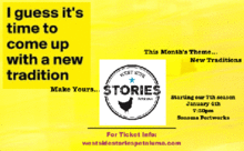 1st Wednesday of every month we gather at Sonoma Portworks (613 2nd St. Petaluma) to tell some true personal stories. You don't have to but, if you want to tell a story, just toss your name in the hat. 10 tellers max. get chosen to tell their tale. They tell a 5 Minute-True Story based on that evenings theme. January 4th we're starting our 7th season and our theme is NEW TRADITIONS At the end of the evening one teller is chosen as the audience favorite and is invited into the GrandSlam December 6th @ The Mystic Theatre. It's that simple, really.