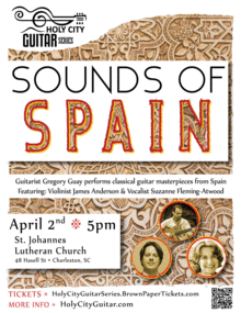 Holy City Guitar Series: Sounds of Spain, April 2, 5pm. Featuring classical guitarist Gregory Guay, with special guests James Anderson on violin, and Suzanne Fleming-Atwood, voice.