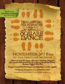 The 10th Annual Healdsburg Food Pantry Square Dance will feature a western dinner by KR Catering, wines from Toad Hollow, music by Manzanita Moon, square dancing with infamous caller Steve Minkin, and fabulous items up for bid, presided over by auctioneer Ziggy the Wine Gal!