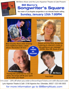 Songwriter's Square - January 15th, 2017 Three incredible songwriters chat with host BILL BERRY about music and perform their songs in an intimate "in-the-square" setting. Fourth great year!