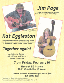 NORTHWEST SINGER/STORYTELLERS JIM PAGE & KAT EGGLESTON Get together again for an ALL ACOUSTIC NIGHT OF SONG & STORY. To quote Utah Phillips, "If you are going to get the message, Jim is the messenger."
