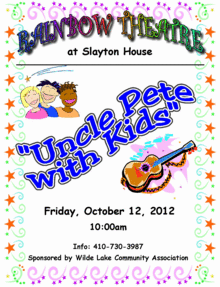 Rainbow Theatre at Slayton House continues this season's series with a special performance by "Uncle Pete with Kids" on Friday, October 12, 2012. Join us for this wonderful children's interactive musical celebration. This is a unique and energetic musical performance for the enjoyment of children and their families. Show time is 10:00am in the Slayton House Theatre in the Village of Wilde Lake, Columbia. Tickets should be purchased in advance for $5 each and may be available at the door for $6 each; exact cash or check only, no reservations, no refunds. Group rates. For information call 410-730-3987. Sponsored by Wilde Lake Community Association. Email wlevents@columbiavillages.org or go to our website "wildelake.org" for a copy of this season's brochure.