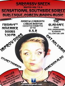 A packed to the gunnels cabaret evening of comedy, magic, music, burlesque and the downtright bizarre. Taking place in the Southside of Glasgow's new number one hot spot of a venue, The Glad Cafe. Sarcassy will be presenting a fantastic line-up showcasing some of the excellent talent the Southside has to offer and special guests Cat Aclysmic and Homesick Aldo. All are getting together to promote, raise funds and give a taster of the inaugral Southside Fringe which aims to put the Southside firmly on the Glasgow arts map with a fortnight of arts and entertainment spanning the Southside in May 2013.