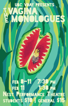 UBC VDAY's "The Vagina Monologues" will be running Feb 8th to 11th 2017 at the UBC NEST Performance Theatre. Doors on the 8th to 11th are at 6pm, show begins at 7:30pm. We will have a matinee show on the 11th, doors at 12pm, and show begins at 1:30pm. All proceeds are donated to local anti-violence organisations.