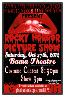 Tickets: Pre-sale [pinkboxburlesque.com/RHPS] $15 at the door day of show. *Includes donation to the Bama Theatre Renovation and Preservation Fund.
