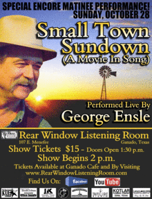 Imagine ... you are in your bed in the state of pre-dawn sleep, the windows up because you don't have air conditioning, in fact, air conditioning isn't in your vocabulary yet. Your eyes creak open as you become aware of a rooster, maybe two, crowing in the distance. You begin to be aware of your surroundings. At the same time, the distinct aroma of cooking bacon from your mom's kitchen is welcomed by your sense of smell; and the all too familiar words, "time to get up, breakfast is ready!" settle in. No doubt about it, this is going to be a great day! We invited George back to perform his Song Play especially for a matinee show, and he said "YES." This is a show that just brings back so many sweet memories from the small town life. For those who grew up in a small town, it will take you on a wonderful roller coaster of emotion as you are reminded of the heart-warming, simple life style that only a small town offered. For those who grew up in the city, you will be transported to a place in time that transcends the busy, manicured life city living often brings; everyone will truly experience what attracts many people to the small town life.