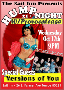 Welcome to the debut of Hump Night Burlesque, presented by Provocatease! A new monthly show at The Sail Inn to spice up the middle of your week. The cast of Provocatease will bring you their signature blend of sexy burlesque stars, mind bending magic, knee slapping comedy, death defying sideshow stunts and live music that will leave you wanting more! Wednesday just might become your new favorite day of the week.