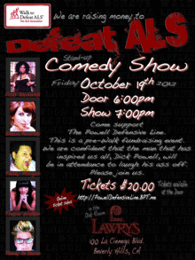 Friday, October 19th 2012 we are producing a an amazing Comedy Show to raise money to Defeat ALS. This Comedy Show will raise money for The Powell Defensive Line TEAM that was created by Michelle Hanson (Dick Powell's daughter). The team is registered to participate in the Walk to Defeat ALS on October 21st. To join the team, learn more about the Walk, or ALS or Dick Powell and his family please go to this link - http://webgw.alsa.org/site/TR/Walks/GoldenWest?team_id=213951&pg=team&fr_id=8174