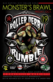 Don't miss the last bout of the 2012 season, and 4th Annual MONSTER'S BRAWL! The Old Capitol City All-Stars will be taking on the Twin City Derby Girls from Champagne-Urbana, Ill on FRIDAY, October 19th at the Coralville Marriott. Doors open at 6:45pm and the bout starts at 7:30pm. Get your tickets here or pay $13 at the door! Kids ten and under are always free. Come dressed for the costume contest at half time!