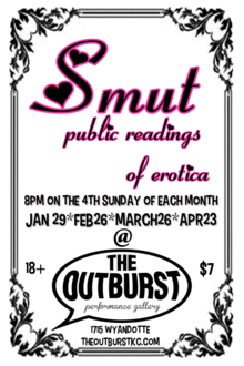 SMUT Onstage: Public Readings of Erotica, is a monthly show at The Outburst KC, the newest performance venue in the Crossroads Arts District. Smut Onstage features professional entertainers and other notable figure reading their choice of erotica. All styles, from classy classics to the best of Penthouse Forum may be represented.