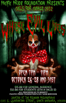 For the first time, Pacific Pride Foundation - the Central Coast's primary LGBT Organization - presents Chills for Change, a haunted house fundraiser. The theme for this year's haunted house is "Where Evil Lives," where guests are invited to walk through a closet door and into the Boogeyman's world.