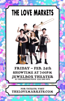 The Love Markets return to the Jewelbox! Welcome to the world of The Love Markets, where Weimar Berlin meets New Orleans and pulp heroines stalk the shadowed streets. Don't miss this night with this acclaimed cabaret band as they play songs from their albums BEAUTY FACTORY and WORLD OF YOUR DREAMS. Lift a glass to smoky tangos, carnivalesque waltzes, back-alley brass and barfly blues from your candlelit table in the Jewelbox Theater, a Seattle treasure since 1926. See you Feb 24 for great food, wondrous booze, and songs of love and revolution! "Irresistible... Intoxicating theatricality... A deliciously dark carnival." - Seattle Magazine