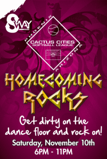 SWAY Events presents Cactus Cities Softball League's Annual Fall Fundraiser, Homecoming Rocks! Saturday, November 10th at Phoenix Place Hotel ad Suites from 6PM - 11PM.
