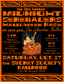 Make plans now for the 3rd Annual Midnight Serenaders Halloween Bash to be held again this year at the lusciously exquisite Secret Society Ballroom in NE Portland. Opening the show will be special guests, the very cheeky, all-female vocal group Libertine Belles. A mystery performance is also in store, as well as an appearance by Portland burlesque sensation Edie En Garde. Last year's Halloween Bash was quite the event, so you can expect another thrill filled evening hosted by one of Portland's most popular vintage swing bands, the Midnight Serenaders. In addition to a full bar as well as food, the Secret Society will be offering Zombies as a special drink to help make things a bit more festive. Come dance and/or hang out, with or without costume, and be a part of this annual Halloween themed happening.