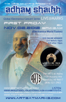 The ARTS at Marks Garage kicks off their LIVE@MARKS Global Electronica Concert Series with DJ Adham Shaikh on First Friday, November 2, 2012 at The ARTS at Marks Garage from 9pm-2am with local opener DJ Mr. Nick.