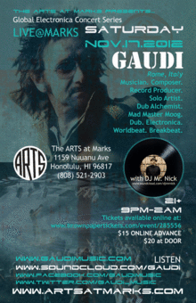 The ARTS at Marks Garage continues their LIVE@MARKS Global Electronica Concert Series with DJ GAUDI on Saturday, November 17, 2012 at The ARTS at Marks Garage from 9pm-2am with local opener DJ Mr. Nick.