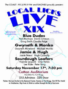 The Coast presents our 19th Annual Concert for Music In Our Schools. The Premiere Concert Event of the Year. An all acoustic evening featuring (alphabetically): Blue Dudes - Nat Montoya, David Jonason, Doug Smith & Claudia Paige : Gwyneth & Monko - Gwyneth Moreland & Michael Monko : Jamie & Hugh - Jamie Peters & Hugh Connolly : Sourdough Loafers - Frannie Leopold, Chip Yerbic, Lee Rider & Peter Barg