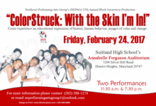 The award-winning Northeast Performing Arts Group (NEPAG) will present their 37th annual Black Awareness production ColorStruck: With the Skin Im In! for two performances on Friday, February 24, 2017 at the Annabelle Ferguson auditorium, located at 5200 Silver Hill Road, Forestville, Maryland 20747. ColorStruck: With the Skin I'm In! is a thought-provoking dance musical (dansical) wrapped in the effervescence and energy of the Northeast Performing Arts Group. Come experience an educational expression of history, human behavior, images of color and change. See how today's youth overcome the destructive forces of color bias and create hope for embracing humanity. This dansical is told through the eyes of children through dance. Please join us and be entertained, educated and uplifted by performers ranging from ages three through adult. Performances will be held on Friday, February 24 11:30 a.m. (for general public, schools, seniors, and city officials --$7 in advance/$10 at the door, groups of 15 or more must RSVP by Friday, February 17) and 7:30 p.m. evening performance --$20 in advance/$25 at the door.