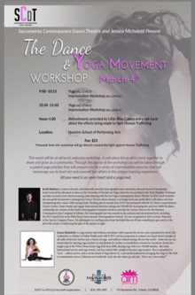 This event will be an all levels welcome workshop. A safe place for all to come together to share and grow as a community. Through the course of the workshop you will be taken though a guided yoga practice that will prepare you for a series of improvisation exercises that will encourage you to trust not only yourself but in others in this unique inspiring experience. Following class, there will be a reception with refreshments provided by Little Bliss Cakery and a speaker providing information on efforts being made in the fight against Human Trafficking.