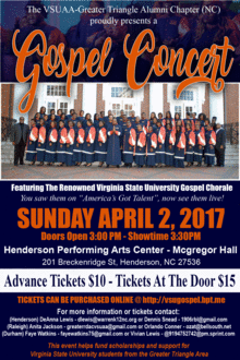 It's OFFICIAL. The VSUAA-Greater Triangle Alumni Chapter (NC) is proud to present the renowned Virginia State University Gospel Chorale on Sunday, April 2, 2017 in concert at the Henderson (McGregor Hall) Performing Arts Center, 201 Breckenridge St, Henderson, NC 27536. Doors open at 3:00pm. Opening act begins at 3:30pm and concert begins at 4:00pm. Advance tickets are $10 each. OTickets at the door are $15 each. This event supports scholarships and support for our VSU students from the area.