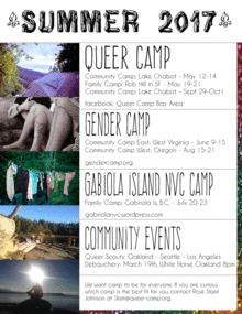 Come to one or come to all three! Spring Queer Camp: Lake Chabot May 12-14 FB: https://www.facebook.com/events/184150065402379/ Registration: http://bpt.me/2873254