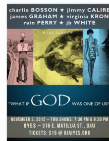 Charlie Bosson, Jimmy Calire, James Graham, Virginia Kron, Rain Perry & JB White will perform songs that explore the different ways we think about and experience God at the Ojai Youth Entertainers Studio on Saturday, November 3, 2012. Two shows at 7:30pm and at 9:30pm.