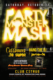 Party Monster Mash! October 27, HML Productions and Anticipations EDM Weekly brings you Party Monster Mash! Party Monster themed costume party. Bring your wildest party monster attire and your dancing shoes! EDM music, live performances by Hang The DJ, Dj Cassanuova, Pro-K, and 38 Super! Special guest host Earth Intruder will be there with the San Diego Club kids!