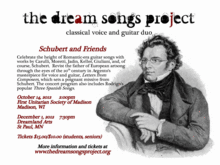 Formed in 2010 by mezzo-soprano Alyssa Anderson and guitarist Joseph Spoelstra, the dream songs project has performed in venues across the Midwest. The duo programs a wide range of repertoire, including guitar transcriptions of lute songs and opera arias, classical and romantic art songs written for the instrument, as well as modern pieces and newly commissioned works for the ensemble. In 2012, the dream songs project was awarded a Metropolitan Community Arts Council Community Arts Grant to fund a series of performances focusing on voice and guitar pieces by Minnesota composers and to fund a commission for a new piece for the duo by composer Daniel Nass. This award was made possible because of the Arts & Cultural Heritage Fund, part of Minnesota's 2009 Legacy Amendment. Through the incubator program of Springboard for the Arts, the dream songs project is a not-for-profit organization.