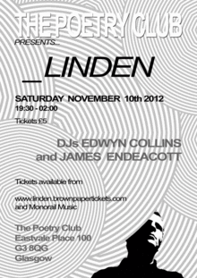 Linden plus Dj set from Edwyn Collins & James Endeacott (AED Records), The Poetry Club, Glasgow