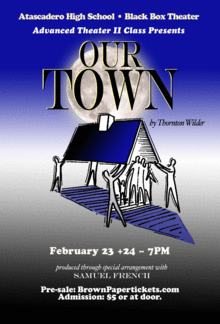 AHS Advanced Theater II Class and Director/Teacher Sabrina Pratt, brings "Our Town" alive in the Black Box Theater. Described by Edward Albee as "...the greatest American play ever written," the story follows the small town of Grover's Corners through three acts: "Daily Life," "Love and Marriage," and "Death and Eternity." Narrated by a stage manager and performed with minimal props and sets, audiences follow the Webb and Gibbs families as their children fall in love, marry, and eventuallyin one of the most famous scenes in American theaterdie. Don't miss this metatheatrical, three-act play by Thorton Wilder. Performance dates are Febrauary 23 and 24, 7pm in the Black Box Theater at Atascadero High School. Call (805)-464-7110 or email atascaderodramaboosters@gmail.com for more information.