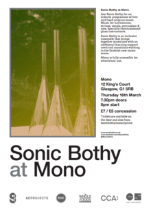 Sonic Bothy is an inclusive ensemble that brings together musicians with an additional learning support need and musicians working in the Scottish new music scene. In recent years, Sonic Bothy has played at Counterflows, GIO Fest V VII, Sound Festival and as part of City Halls Sound Lab Presents... Series.