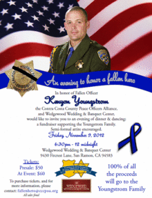 In honor of Fallen Officer Kenyon Youngstrom the Contra Costa County Peace Officers Alliance and Wedgewood Wedding & Banquet Center, would like to invite you to an evening of dinner & dancing; a fundraiser supporting the Youngstrom Family. Semi-formal attire encouraged.