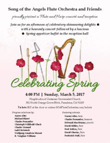 Featured soloists include flutist David Shostac, harpist Naomi Alter, jazz flutist Fred Selden, bassoonist (and conductor of SOA Orchestra) Charles Fernandez, flutist David Miller, flutist (and SOA Orchestra founder) Frederick Britton Staff, and Deborah MacMurray on piccolo. Compositions by Mozart, Bloch, Blavet, Vaughan Williams, Ladd McIntosh, Aaron Alter, Gluck and Charles Fernandez and others will be performed at this Spring Celebration.
