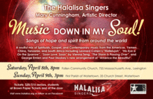 Music Down in My Soul features heartfelt, joyful selections to inspire hopefulness, strength in action and togetherness for both the audience and singers. Focusing on music with lyrics including We keep our dreams alive, together we survive, the program brims with positive spirit and inspirational messages of hope. This soulful mix of spirituals, gospel, and contemporary choral music spans 300 years of courage and resistance from the Americas, Yemen, China, Tanzania, and South Africa, sung in Mandarin, Spanish, Hebrew, Swahili and Zulu. These are songs of praise bursting with joyful energy, dynamic contrasts, captivating solos, exciting percussion, and a wide range of layered vocal textures.