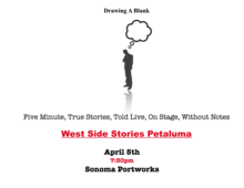 1st Wednesday of every month we gather at Sonoma Portworks (613 2nd St. Petaluma) to tell some true personal stories. You don't have to but, if you want to tell a story, just toss your name in the hat. 10 tellers max. get chosen to tell their tale. They tell a 5 Minute-True Story based on that evenings theme. Our 7th season continues April 5th and our theme is Drawing a Blank. At the end of the evening one teller is chosen as the audience favorite and is invited into the GrandSlam December 6th @ The Mystic Theatre. It's that simple, really.