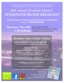 Join Mayor Terry Tornek, Civic leaders, Pasadena residents, Business leaders, Educators and the Interfaith community for the 44th Annual Pasadena Mayor's Interfaith Prayer Breakfast held at the Pasadena Convention Center - Ballroom May 4th @ 7:30am prompt