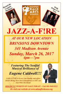 Every last Sunday, the Memphis Black Arts Alliance is delighted to present some of the BEST artist in the area at Jazz-A-F!RE, held this month on March 26, 2017 from 4-7pm at Brinson's Downtown, 341 Madison Avenue.