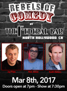 It's Rebels of Comedy at the Federal Bar in North Hollywood. Come out and see a night of live comedy, featuring an awesome lineup of professional features and headliner comedians. Hosted by Jay Flats with Rob Jessie and Keith Nelson