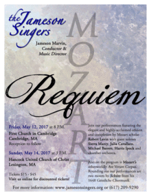 The Jameson Singers 7th season comes to a memorable conclusion with two performances of the Mozart Requiem with soloists Sierra Marcy, Julia Cavallaro, Michael Barrett, and Harris Ipock. When Mozart died in 1791 at the too-young age of 35, he left an unfinished masterpiece. Yet the Requiem has become, deservedly, one of the most popular choral works of all time. Our performance features the elegant and highly-acclaimed edition and completion by virtuoso pianist and Mozart scholar Robert Levin.