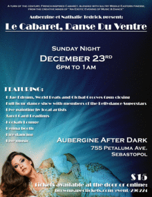 Brought to you from the creative minds of "An Exotic Evening of Music and Dance", Aubergine et Nathalie Tedrick present, "Le Cabaret, Danse Du Ventre"- A turn of the century French-inspired Cabaret blended with sultry Middle Eastern finesse. Featuring local and international Belly Dance talent, including members of the Bellydance Superstars!