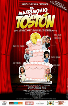 Del dramaturgo puertorriqueño Héctor Méndez (autor de los éxitos Ay bendito que Puerto Rico y La nena esta preñá) nos llega su más reciente comedia. Una que trata sobre la vida en matrimonio y las cosas que le puede suceder si usted está casao o piensa hacerlo en El matrimonio es un tostón. Si te divertiste con Ay Bendito y La nena no puedes perderte esta comedia que mediante escenas cómicas nos lleva a un viaje que describe el estar en pareja, vivir en pareja y los altos y bajos que puede suceder cuando uno le da el si al otro y comienzan su vida en matrimonio. Porque no es lo mismo estar de novios que ya ser marido y mujer. Si has tratado de grabar un mensaje de voz para tu celular con tu pareja, si has tratado de usar el GPS cuando vas con tu pareja en el auto, si te llama alguien por la noche y tu pareja pregunta ¿Quién te está llamando?, si quieres conocer que pasa con una pareja de reporteros de un noticiero y si quieres saber cómo serían Adán y Eva en Puerto Rico no te puedes perder esta excelente comedia que de seguro saldrás del teatro más enamorado de tu pareja o reirás a carcajadas de las cosas que pasan porque a ti también te pasan. El matrimonio es un tostón cuenta con las actuaciones de un elenco de excelentes actores boricuas que te harán reír de principio a fin: Irina Veruschka, Miguel Pinpolin Resto, Chadelle Montalvo, Jorge Castillo, Héctor Méndez y la presentación de Lourdes Chacón haciendo teatro en la Florida. Dirigida y escrita por Héctor Méndez. Una producción de Sangre Gitana. Ven a reír de lo lindo con este tostón que de seguro te hará pensar sobre tu matrimonio y el de los demás. Porque a veces estar casao y en pareja es tremendo tostón.
