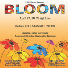 Laguna Beach High School invites you to attend its annual Spring Dance Concert, BLOOM, on Thursday, April 27th, Friday, April 28th, or Saturday, April 29th at 7:00pm. The Spring Dance Concert is features all of the students in the dance program. The performances include faculty choreography from Director, Estee Carrizosa, and Assistant Director, Samantha Gardner, plus guest choreography from Michael Munday, Emily Crouch, Erika Fernandez, Amanda Gardner, and Pauline Kyne. For more concert information, follow @lbhsdance on social media, and please spread the word using the hashtag #LBHSBLOOM! See you at the show!