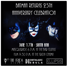 Join Nostalgic Nebula on June 17th as we celebrate the 25th anniversary of Tim Burton's 1992 classic Batman Returns beneath the streets of Downtown Santa Ana at the Bar Ellipsis with live music, dancing, food & drinks, prizes, giveaways and more! Following the celebration, there will be a free screening of Batman Returns a short walk away at the Frida Cinema where you can cheer along for our Caped Crusader as he fights anarchistic circus performers, the sultry and nimble Catwoman, and a big-city megalomaniac billionaire.