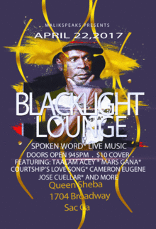 The Blacklight Lounge takes off again at Queen Sheba with live music, spoken word, and honey wine. Come enjoy the best entertainment in Northern California on April 22nd.