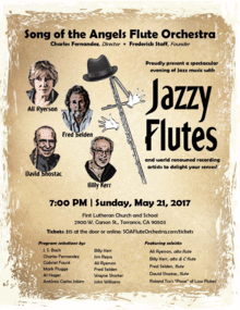 Enjoy beautiful jazz music with a full flute orchestra featuring recording artists Ali Ryerson, Billy Kerr, Fred Selden and David Shostac. Flutes of all sizes are featured with an emphasis on lower flutes, including the rare Double Contra-Bass Flute and the F Contra-Bass Flute. Program selections include jazz arrangements of classic pieces by J.S. Bach and Faure, original jazz compositions, along with popular John Williams movie themes.