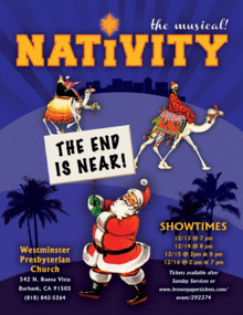 NATIVITY: THE MUSICAL! Doomsday or bust! December 13, 14, 15, 16 in Burbank Now going into its eighth year, Nativity: The Musical! runs December 13-16. So if the world should end on December 21, as doomsday prophets would have us believe this could be your last chance to see the musical The Burbank Leader calls a "hysterical and yet touching blend of the Christmas story" complete with a "Felliniesque flock" of characters in what might seem a "heavily-spiked-nog-laden-dream." The original musical comedy is written and directed by entertainment industry veterans Greg and Melissa Baldwin, who weave in fresh topical references each year. Be it the Jonas Brothers, striking Hollywood writers, Lady Gaga or the doomsday crowd that's counting down the days on the Mayan calendar the Baldwins and their cast of 100 leave no pop culture phenomenon unskewered as the birth of Christ is retold in song and shtick. "Enjoy the lighter side of Nativity," urged Los Angeles Daily News. Staged by Imagine, the drama ministry of Westminster Presbyterian Church (http://www.westpresburbank.org <http://www.westpresburbank.org> ), performances will take place on December 13 (7 p.m.), 14 (8 p.m.), 15 (2 p.m. and 8 p.m.) and 16 (2 p.m. and 8 p.m.) in the church's sanctuary, located at 542 N. Buena Vista Street (at the corner of Buena Vista and Clark) in Burbank. A donation of $10 per adult (or $8 in advance) and $7 per student (or $5 in advance) is suggested. For tickets or more information, call Westminster Presbyterian Church at (818) 842-5264. Check out YouTube videos of numbers from previous seasons of Nativity: The Musical! at: "The Three Wise Guys" http://www.youtube.com/watch?v=pVHS3pFSy2M&feature=related "Soothsayer, Soothsayer" http://www.youtube.com/watch?v=UHTPC_MiZ3Y