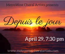 The MetroWest Choral Artists (Leonardo Ciampa, artistic director) presents "Depuis le Jour," a concert of French music, featuring Poulenc's "Gloria" (Ellen Allen, soprano soloist).