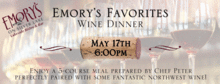 Emory's Favorites Wine Dinner May 24; 6:00pm Tickets must be purchased in advance. Cost: $120.00 (includes tax & gratuity)