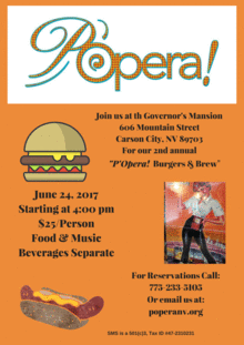 Our second annual "P'Opera! Burgers & Brew" is heating up at the Governor's Mansion! Head on down for some P'Opera! Music, Sunshine, and Delicious Food on the beautiful grounds of the Governor's Mansion located at 606 Mountain Street in Carson City. Beverages sold separately. $25